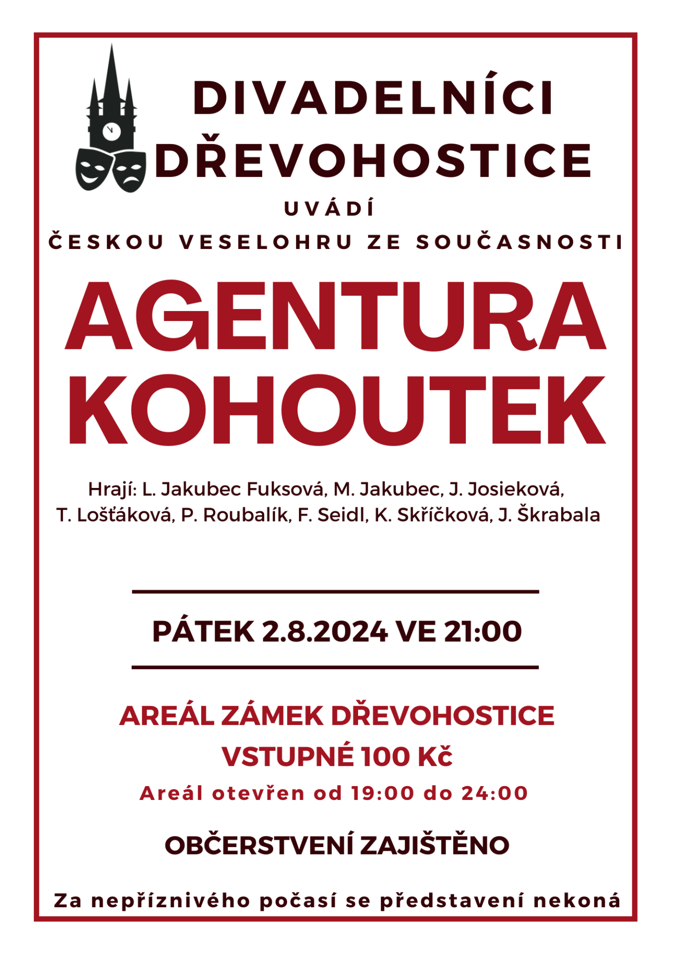 Děj této ryze české komedie nám ukazuje naši typickou povahu – vydělat na čem se dá a co nejjednodušším způsobem. Ocitáme se v rodině Kohoutkových, kde tatínek Emil – učitel hudby, opakovaně trestaný za sex se svým mladistvými studentkami a maminka Eliška vlastnící Seznamovací kancelář Kohoutek, která slibuje lidem seznámení s životním partnerem a sňatek. Všechno je ale jedním velkým podvodem. Jedinou nevěstou je slečna Mílková, která však odjede do Holanska za svým nápadníkem a sjednané schůzky tím pádem ruší. V tomto podniku Elišce pomáhá od začátku její syn Jaroušek a na místo slečny Mílkové se nabízí jediná možost, jeho nová ztřeštěná přítelkyně Gábi Sladká. Oba jsou ochotni udělat téměř cokoli, aby byl klient spokojený a rád zaplatil. Proto se seznamujeme s příběhem němce Kurta Šuterštajna, kterému zemřela žena Gizela a potřebuje za ni náhradu. Gábi nemá problem jej okouzlit, ale mnohem horší je se ho zbavit. Dalším zákazníkem je paní Barbora Čamrdová, která také hledá po smrti svého náruživého manžela někoho, kdo by jej nahradil. Té se zase dokonale věnuje Jaroušek v převleku za malíře Slavíčka. K této dějové linii se přidává Emilova nevěra s mladinkou studentkou Kateřinou Dvořáčkovou, která se pak nedopatřením připlete k podvodným praktikám Eliščiny agentury a pomáhá těm dvěma. Že na každého jednou dojde, je obecná pravda a příjde na to i Eliška. Ale jak?? A kdo je pan Pacička a odkud dojel a proč ?? Ala hlavně, jak to všechno dopadlo se přijďte podívat na derniéru v sobotu 27.dubna 2024 do sokolovny nebo v pátek 2.srpna 2024 na letní představení do zámecké zahrady.